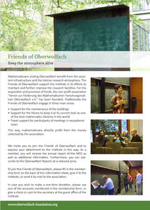 The Horst Tietz Fund is dedicated to providing further financial support for maintaining the inspiring and casual atmosphere of the Oberwolfach Institute. In times when research support has been drastically cut, we are turning to all alumnae and alumni of Oberwolfach for help with additional backing to preserve the legacy of the Institute and guarantee its independence in a time of reduced funding for basic research.